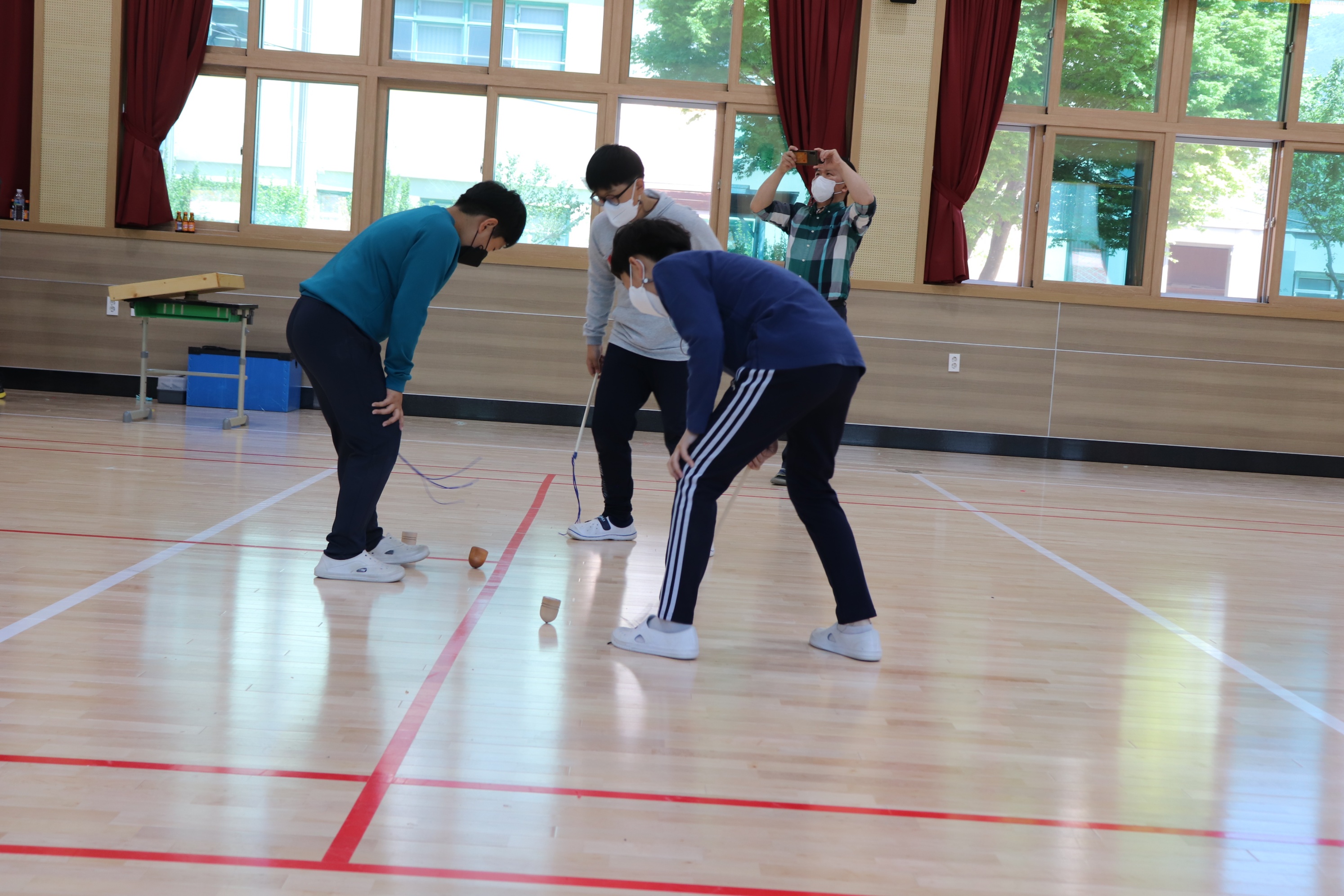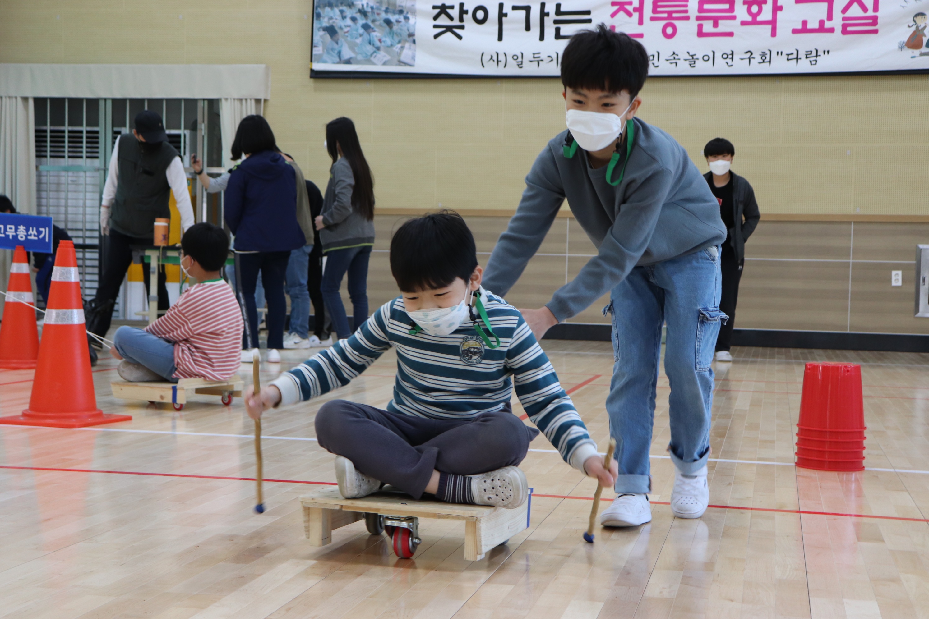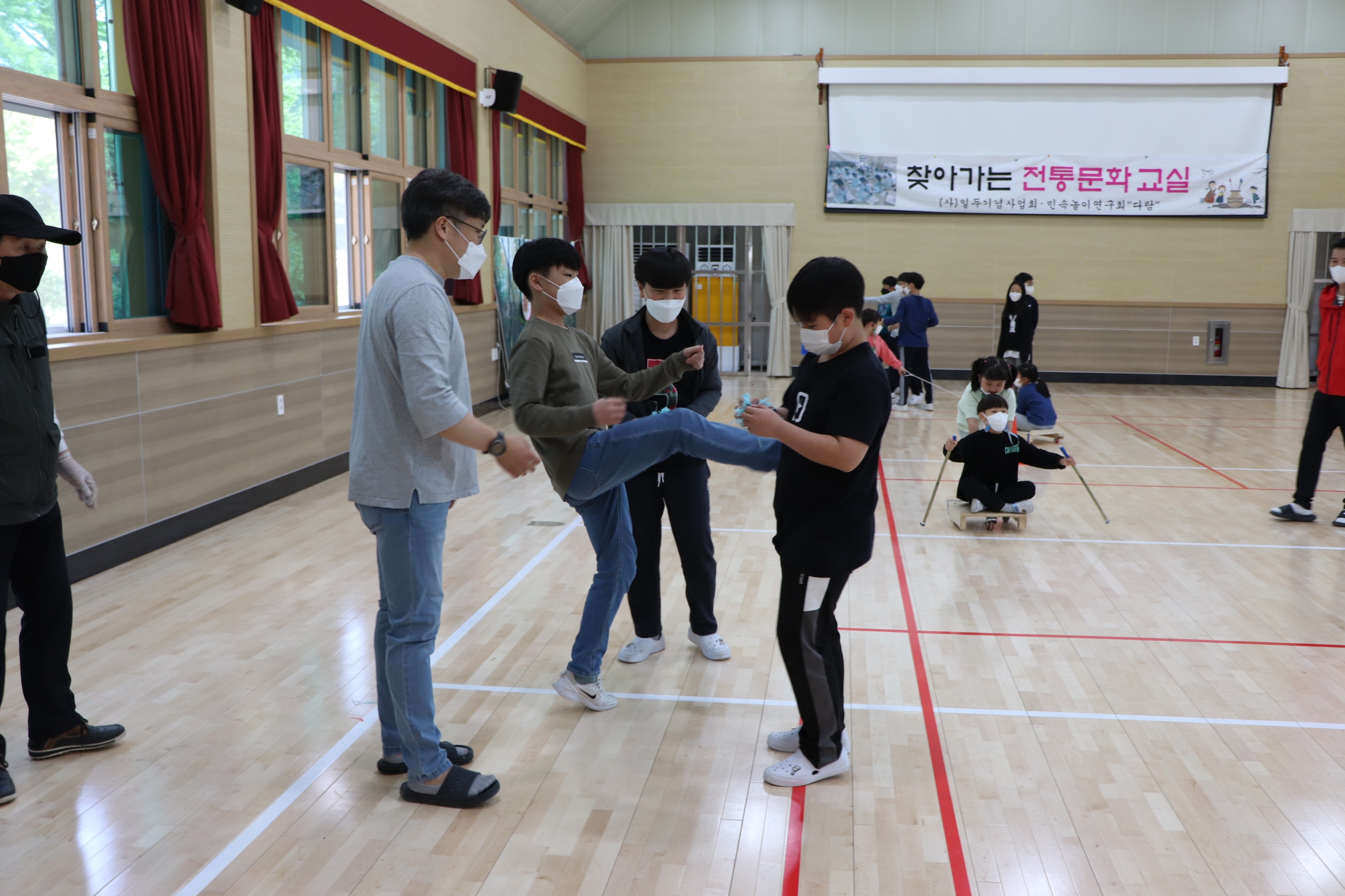 소중한 전통놀이문화 우리가 이어가요! - 마천초, 전통놀이문화 체험 운영 - 마천초등학교(교장 서춘래)는 4월 30일(금) 전교생을 대상으로 마천초등학교 천왕봉관(소규모체육시설)에서 전통놀이문화 체험을 운영하였다. 이 체험활동은 학교 집중 방역 기간 운영에 따른 방역 관리 지침을 준수하여 외부 강사를 대상으로 방역 지침 안내와 발열 상태를 점검하고 전교생의 발열검사와 손 소독을 한 후 밀집도 조정을 통한 거리두기와 마스크 착용 후 진행하였다. 전통놀이문화 체험은 (사)일두기념사업회(회장 김윤수)에서 함양 관내 초등학생을 대상으로 전통놀이문화를 배우는 기회를 제공하여 고장의 전통과 선비문화를 체득하고 생활화할 수 있도록 운영하는 사업이다. 이번 체험은 학습지도 능력이 우수한 퇴직 교원이 강사로 참여하여 학생 수준에 맞는 내용으로 구성한 고장의 역사인물, 전통예절, 선비정신 계승 중심의 인성교육을 주제로 한 선비교실과 고장의 전통놀이 중심의 놀이문화를 직접 체험해 보는 전통놀이 교실로 진행하였다. 이 체험활동을 준비한 정○○ 총무이사는 요즘 아이들은 스마트폰이나 컴퓨터를 이용한 놀이문화에 빠져 우리 전통놀이를 잘 모르는 경우가 많은데 이번 체험활동을 계기로 전통놀이의 즐거움을 알고 즐길 수 있었으면 좋겠다며 바람을 설명해 주셨다. 5학년 김○○ 학생은 “평소에 스피너 돌리는 것을 좋아해서 많이 가지고 있는데, 오늘 팽이치기를 해보니 스피너 돌리는 것과는 다른 재미가 있어서 좋았고, 몸을 많이 써서 운동도 되는 것 같아 일석이조라는 생각이 들었다.”라며 소감을 밝혔다.