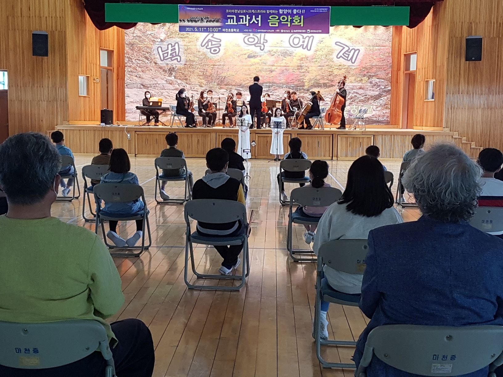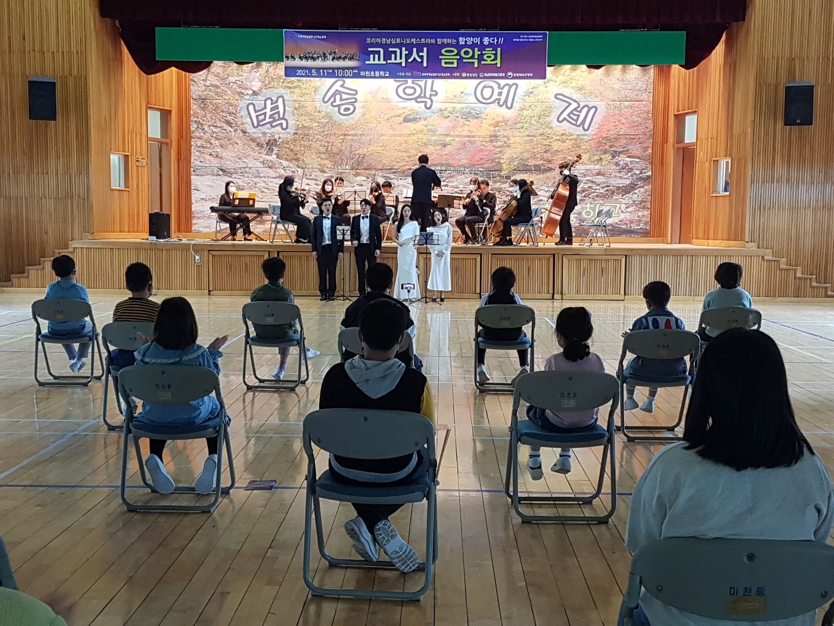 보고 듣고 느끼는 클래식 - 마천초, 코리아경남심포니오케스트라와 함께하는 음악회 관람 - 마천초등학교(교장 서춘래)는 5월 11일(화) 전교생을 대상으로 마천중학교 체육관에서 코리아경남심포니오케스트라와 함께하는 음악회를 관람하였다. 본 관람은 방역 관리 지침을 준수하여 참석한 연주자와 관람객을 대상으로 발열 상태 점검과 손 소독을 하였고, 밀집도 조정을 통한 거리두기와 마스크 착용 후 진행하였다. 교과서에 나오는 음악을 중심으로 준비한 이번 음악회는 경남문화예술진흥원의 문화예술기금을 받아서 진행되는 연주로 코리아경남심포니오케스트라가 주관하여 진행하였다. 코리아경남심포니오케스트라는 2016년 제1회 지리산음악제를 시작으로 창단되었다. 전문예술법인 다볕문화 산하 전문연주단체로서 문화소외지역을 찾아 연주회를 개최하는 등 서부경남을 중심으로 왕성한 활동을 하는 단체이다. ‘위풍당당 행진곡’을 시작으로 ‘놀람교향곡’, ‘사계 중 봄’ 등 어디선가 한 번쯤은 들어 본 것 같은 곡이 연주될 때마다 학생들은 점점 클래식의 세계로 빠져들었다. 음악회 중간에는 비올라, 호른 등 연주에 사용된 악기를 소개하는 시간도 가져 문화적 소양을 확대하는 기회가 되었다. 이번 음악회에 함께 한 벨라보체 앙상블의 ‘푸니쿨리 푸니쿨라’가 울려 퍼지자 학생들은 흥겨운 노래에 맞춰 손뼉을 치며 마음껏 즐기는 모습도 보여주었다. 음악회를 관람한 6학년 최○○ 학생은 “교과서 속에서 본 악기가 실제로 연주되는 모습을 보면서 신기했다.”라며 “클래식은 나와 맞지 않는 음악이라고 생각했는데 자꾸 듣다 보니 재미도 있어서 좋아하게 되었다.”라는 소감을 밝혔다.