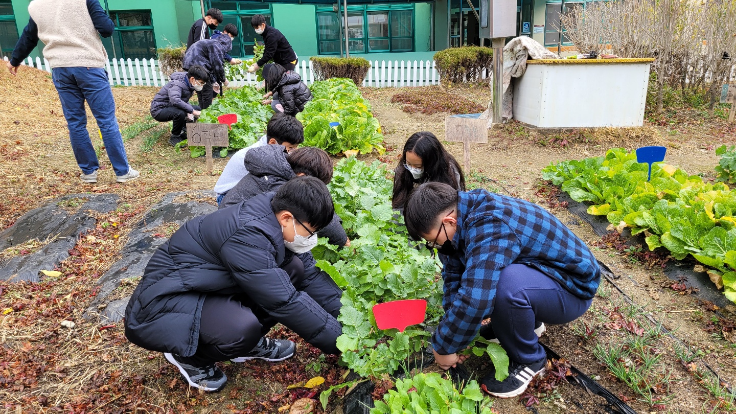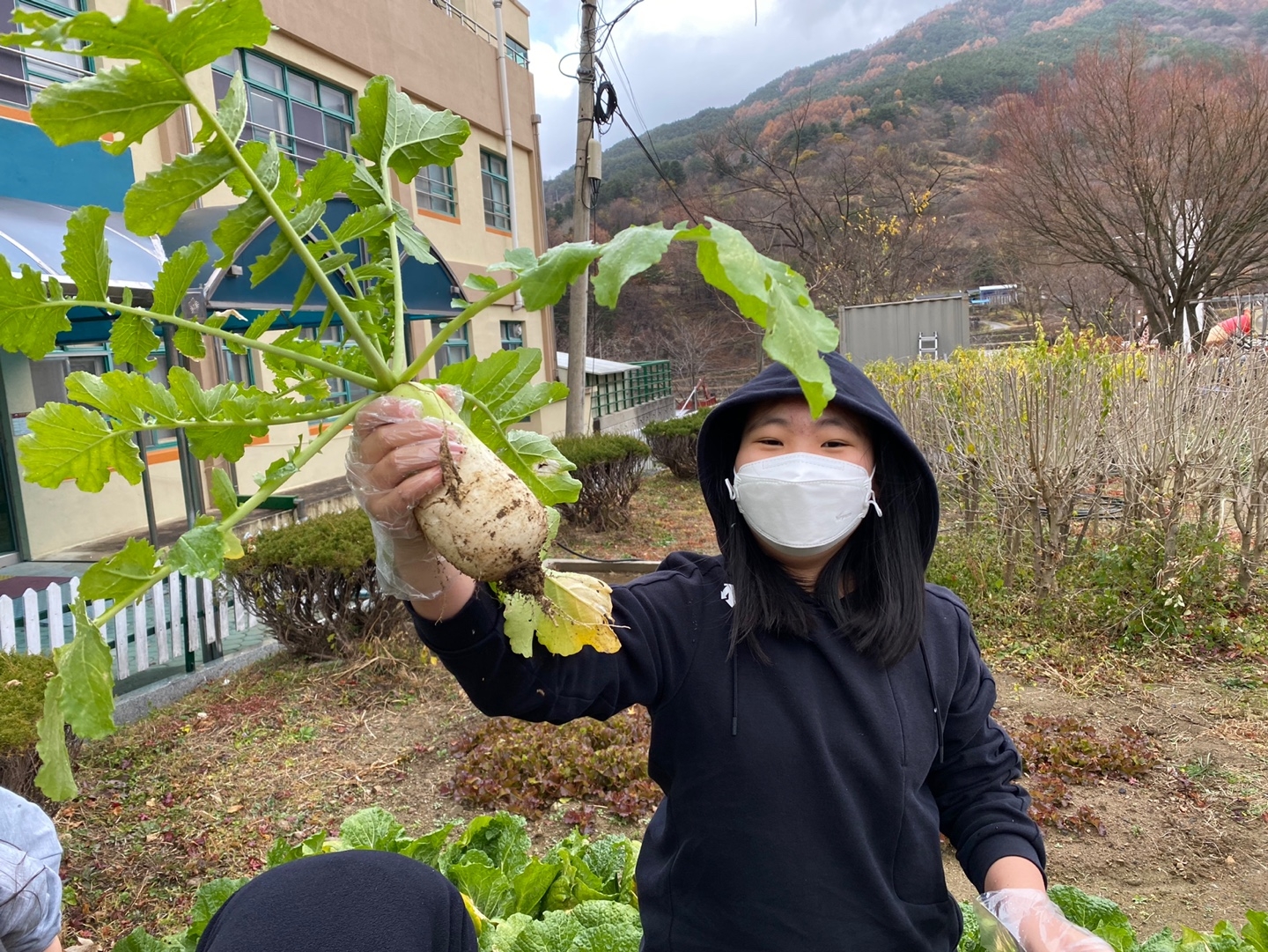 직접 키운 무, 수확의 즐거움을 나누어요. - 마천초, 생태텃밭 작물 수확 체험 - 마천초등학교(교장 서춘래)는 11월 22일(월) 전교생을 대상으로 교내 생태텃밭에서 작물 수확 체험을 실시하였다. 이 체험학습은 모든 참석자를 대상으로 발열 검사와 소독을 한 후 마스크를 착용하고 진행하였다. 마천초등학교에서는 초록학교만들기 프로그램의 일환으로 생태텃밭을 운영하고 있다. 이를 통해 학생들은 생명의 소중함과 책임감, 자연의 아름다움을 직접 경험하며 작물들과 함께 성장하는 교육을 실시하고 있다. 2학기 시작과 함께 심은 배추와 무를 관심과 사랑으로 관리하며 키운 학생들은 이번 체험을 통해 작물 수확 이상의 큰 기쁨을 함께 얻을 수 있었다. 수확한 작물은 각 가정에 전달되어 가정에서의 연계 지도의 소재로도 쓰일 수 있었다. 이 체험학습에 참여한 6학년 심○○ 학생은 “무럭무럭 잘 자라준 배추와 무에게 고마운 마음이 든다. 자연의 소중함을 느낄 수 있었다.”라고 소감을 밝혔다.