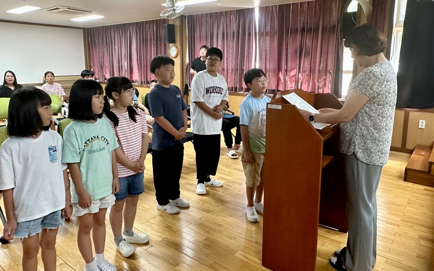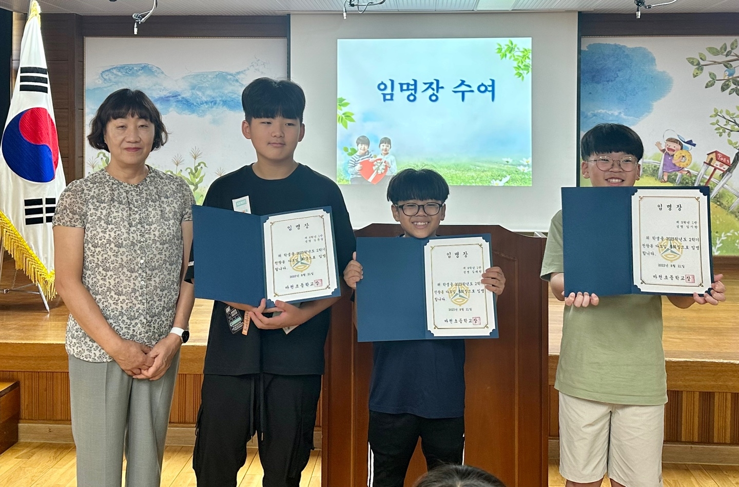 오늘 마천초 다목적실에서 2학기 개학식이 있었습니다. 여름방학을 즐겁고 건강하게 보낸 마천초 어린이들 행복한 모습으로 잘 등교하였습니다. 오늘 개학식에서는 먼저 2학기 천왕봉 학생 다모임을 이끌 학생회 회장 6학년 김문겸, 6학년 부회장 김태원, 5학년 부회장 임시완 학생에게 임명장 수여가 있었습니다. 그리고 지난 6월에 참가한 일두기념회 그림 그리기 대회에 입상한 학생들에게 상장 및 상품을 수여했습니다. 마천초등학교의 멋진 2학기 모습을 기대해주세요.