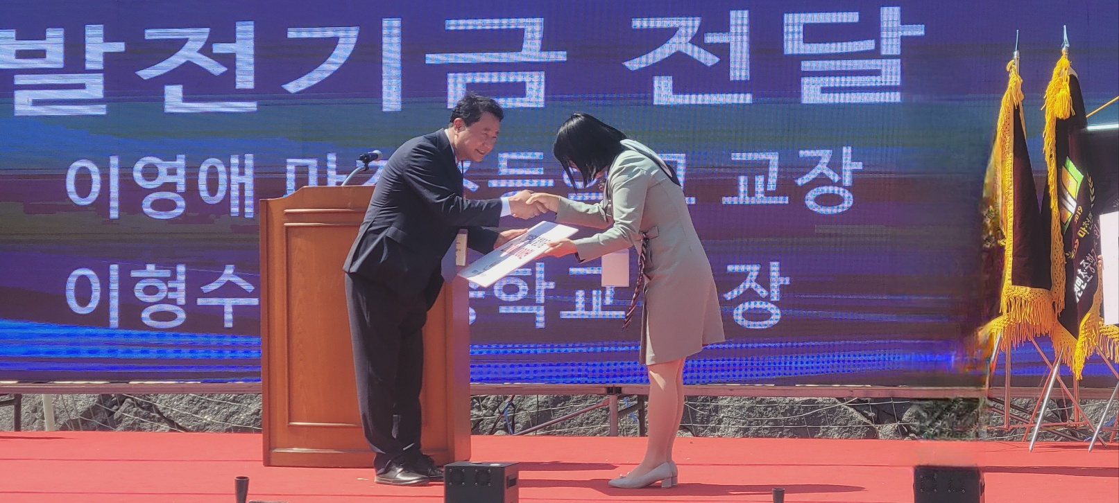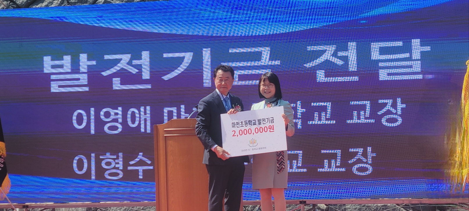 4.26(토)마천산나물축제에 맞춰 마천초.중학교 총동문회가 있었습니다. 우리 학생들이 오프닝무대 초청을 받아 신나는 "아파트"댄스로 행사를 빛냈습니다. 그리고 초.중학교 총동문회에서 2백만원의 발전기금을 기탁하셨습니다. 감사합니다.
